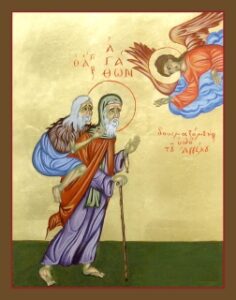 آگاتون زاهدی بزرگ از مصر در سدهٔ پنجم بود. او همعصر قدیس ماکاریوس و شاگرد قدیس لوت بود. او میکوشید تمامی فرمانهای خداوند را بهجا آورد. یکی از برادران او را بابت چاقوی کوچکی که با آن هیزمهای بوتهای برای ساختن سبد میبرید تحسین کرد. چون این تحسین را شنید، قدیس با شادی آن چاقو را بهعنوان هدیه به آن برادر بخشید.