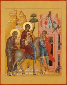 مجوسان (ستارهشناسان) از مشرق، پس از آنکه در بیتلحم خداوند را پرستش کردند، به فرمانِ فرشتهای مأمور شدند که از راهی دیگر به سرزمین خود بازگردند. هیرودیس، آن پادشاهِ شریر، قصد داشت همهٔ کودکانِ بیتلحم را به قتل برساند؛ اما خدا نیتِ هیرودیس را دید و فرشتهٔ خود را نزد یوسف فرستاد. فرشتهٔ خدا در خواب بر یوسف ظاهر شد و به او فرمان داد که کودکِ خردسال و مادرش را برداشته، به مصر بگریزد. یوسف چنین کرد. او کودکِ الهی و مادرِ بسیار مقدّسش را برداشت و نخست به ناصره رفت (لوقا ۲: ۳۹)، جایی که امور خانهٔ خود را سامان داد، و سپس همراه آنان، پسرش یعقوب را نیز برداشته، به مصر رفت (متی ۲: ۱۴). بدینگونه کلامِ نبی تحقق یافت: «اینک، خداوند بر ابر تیزرو سوار شده، به مصر میآید » (اشعیا ۱۹: ۱). امروزه در قاهرهٔ قدیم، غاری که خانوادهٔ مقدّس در آن سکونت داشتند قابل مشاهده است. همچنین در روستای مطریه، نزدیک قاهره، درختی که مقدّسترین تئوتوکوس زیر آن همراه با خداوند عیسی استراحت کرد، و نیز چشمهی معجزهآسا در زیر این درخت، دیده میشود. پس از آنکه خانوادهٔ مقدّس چند سالی در مصر زندگی کردند، بار دیگر به فرمانِ فرشتهای از سوی خدا به فلسطین بازگشتند. بدینسان نبوتی دیگر تحقق یافت: «از مصر پسرِ خود را فراخواندم» (هوشع ۱۱: ۱). هیرودیس مرده بود و پسرِ شریرش، ارکلاوس — جانشینی شایستهٔ او در شرارت — بر تختِ آغشته به خونِ او نشسته بود. چون یوسف شنید که ارکلاوس در اورشلیم حکومت میکند، به جلیل، به شهرِ خود، ناصره بازگشت و در خانهٔ خویش ساکن شد. پسرِ دومِ هیرودیس، هیرودیسِ جوانتر، که اندکی کمتر از برادرش ارکلاوس شریر بود، در آن زمان بر جلیل حکومت میکرد.